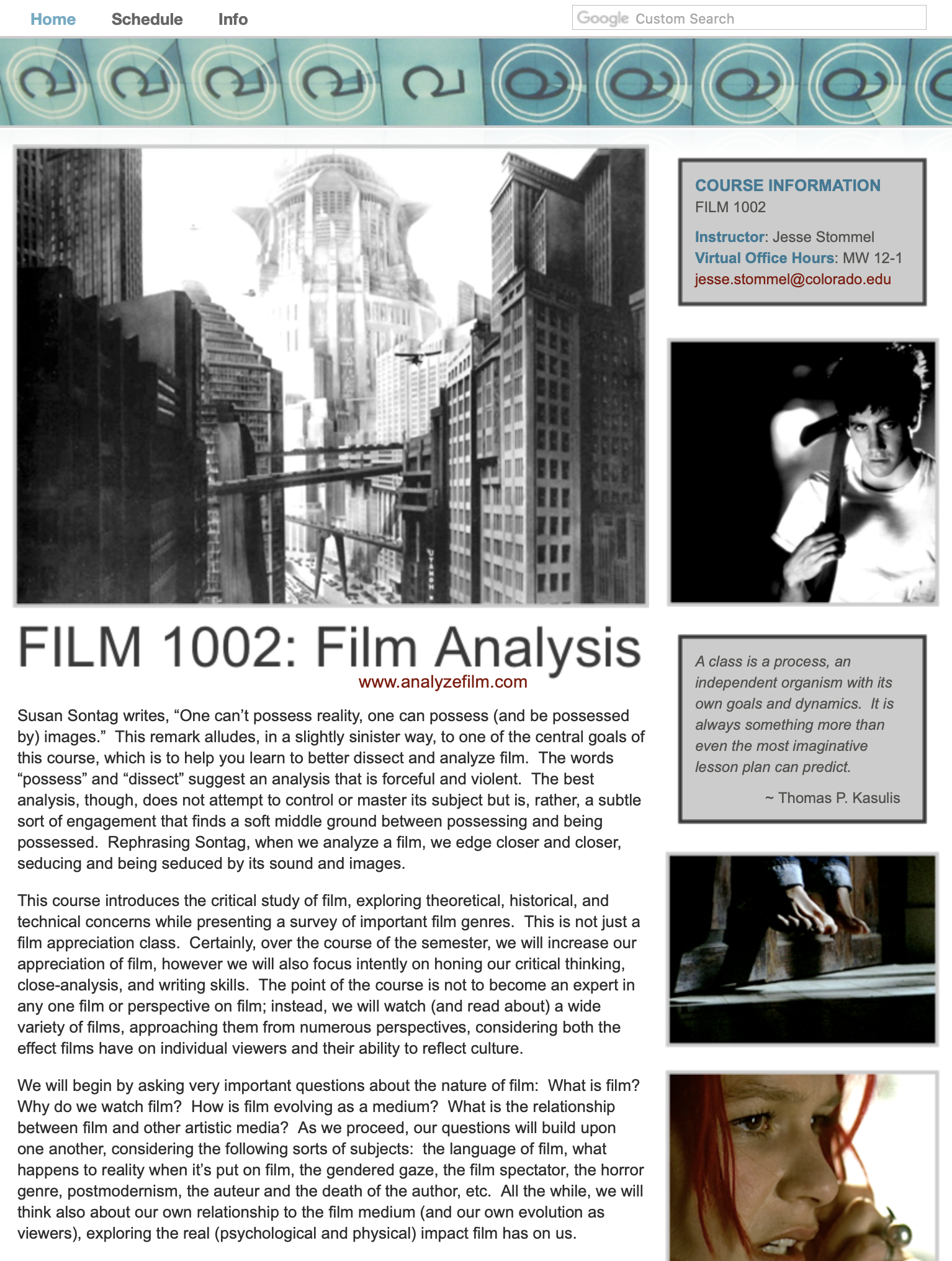 An asynchronous discussion forum will serve as our classroom. There will be 1-2 threaded discussion forum topics open each week, where you will contribute your own ideas about a particular topic and/or set of questions. Rather than just throwing your ideas into a vacuum, you should engage each other by asking questions, answering questions, amplifying/complicating ideas, and otherwise using each other’s posts as jumping off points. I will participate in these forums as I would in the classroom, guiding the discussion as it evolves over the course of the week. The majority of these discussions will ask you to apply concepts from that week’s lecture and reading to specific clips from that week’s film. Links to short clips from the film will often be included on the page for the discussion.