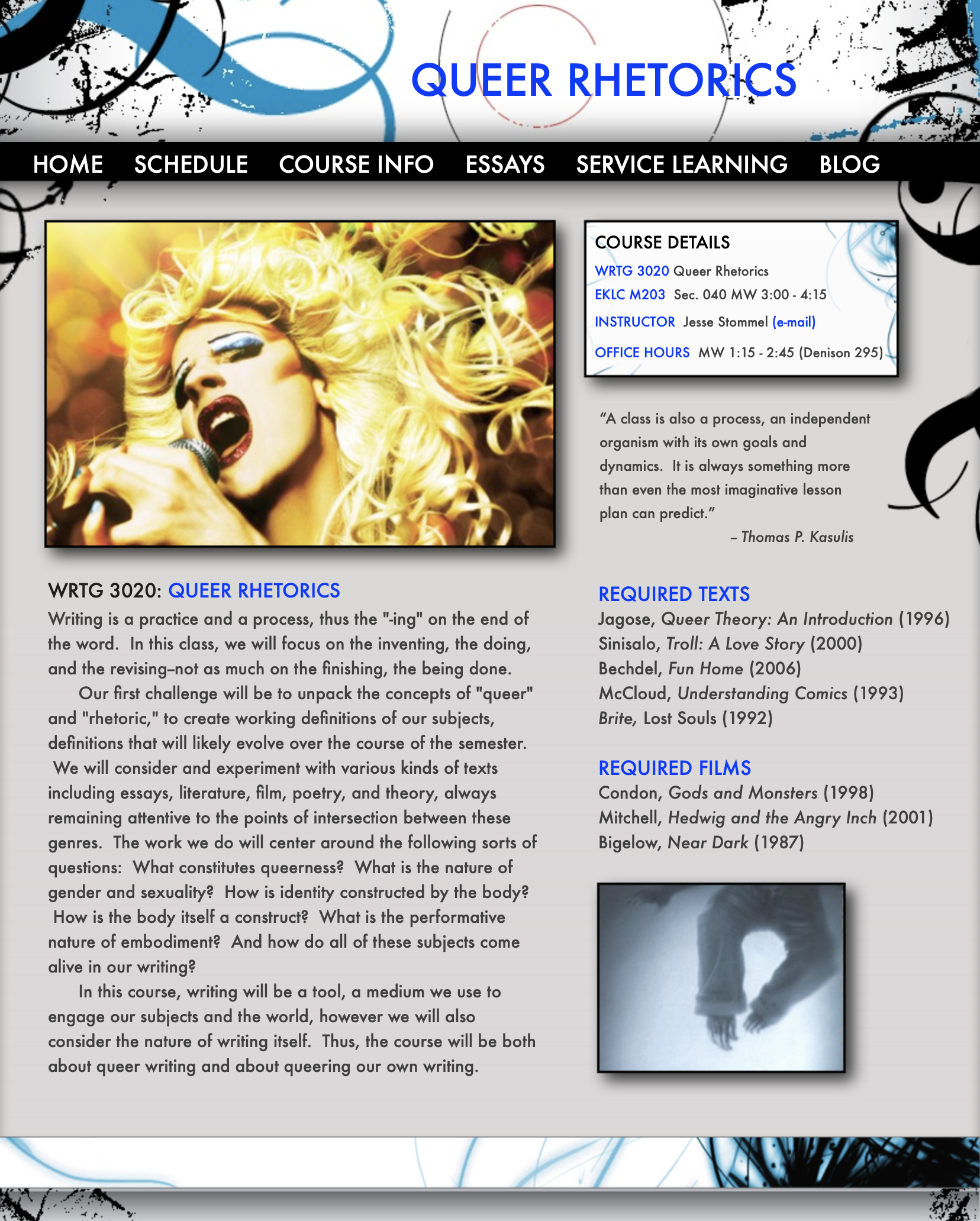 TEXTS AND FILMS: All of the texts of the course have been chosen with several purposes in mind: (1) to serve as representative examples of the various sorts of work we’ll be doing ourselves; (2) as fodder for our own adventures in literary and rhetorical analysis; (3) because they are germane to the various subjects at hand, particularly writing, meaning-making, language, gender, identity politics, and queer theory.